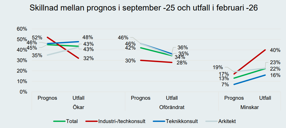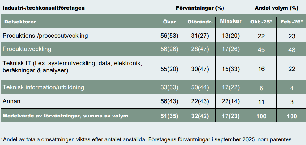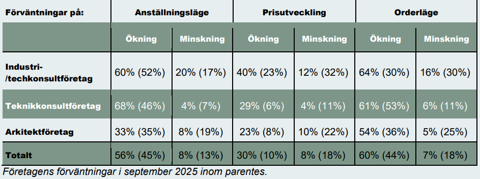 Samtidigt minskar andelen företag som bedömer att de kommer att behöva minska personal-styrkan. Andelen som räknar med uppsägningar sjunker från 7 till 4 procent, medan 28 procent av företagen förväntar sig en oförändrad personalstyrka. Sammantaget pekar utvecklingen på ett stärkt konjunkturläge för teknikkonsulterna, där en bredare optimism om efterfrågan kombineras med minskade nedåtrisker på kort sikt.