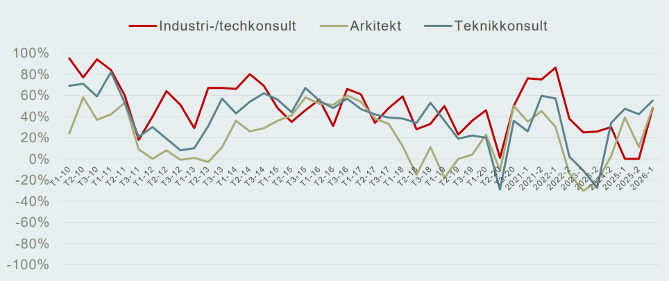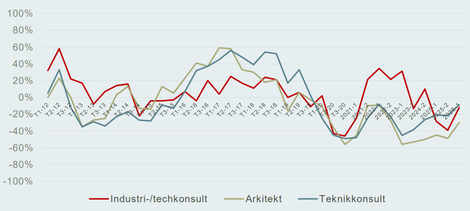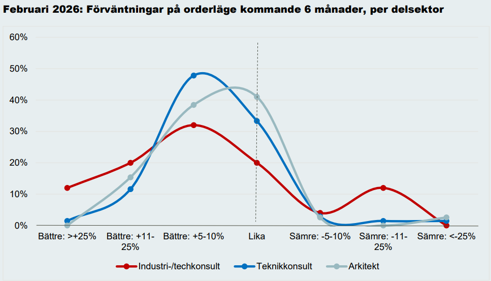För industri- och techkonsultföretagen är förbättringen i förväntningarna i stället i huvudsak kopplad till en ökad optimism kring efterfrågan inom produktutveckling och teknisk IT. Sammantaget speglar detta att återhämtningen i orderläget har flera drivkrafter, som varierar mellan delsektorerna men sammantaget bidrar till en mer positiv helhetsbild.