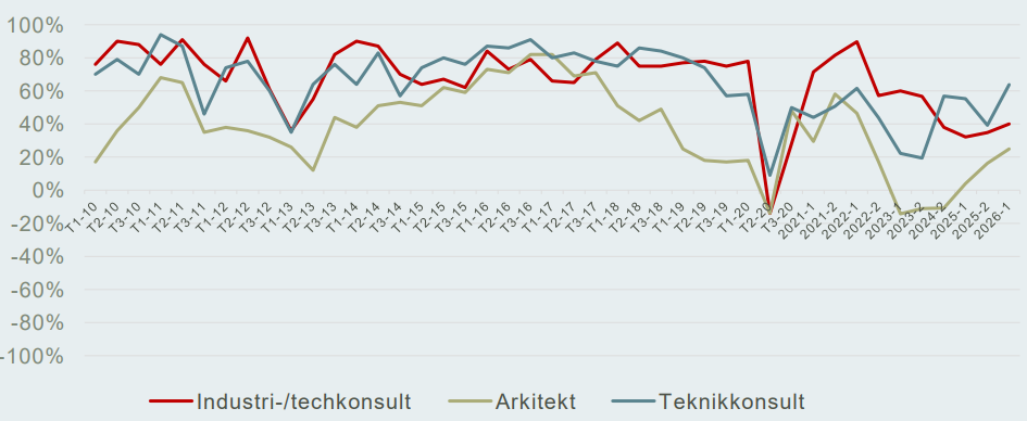 Konfidensindikator[1] för arkitekt-, teknikkonsult-, samt industri-/techkonsultföretag. Visar förväntningar på orderläget kommande sex månader.