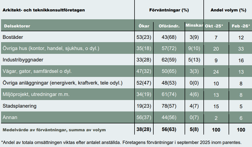 Även bland arkitektföretagen har förväntningarna på orderutvecklingen stärkts tydligt. Andelen företag som räknar med ett förbättrat orderläge under det kommande halvåret uppgår nu till 54 procent, vilket innebär en markant uppgång jämfört med september, då motsvarande andel var 36 procent. Liksom bland teknikkonsulterna bedömer huvuddelen av de företag som förväntar sig en ökning att förbättringen kommer att vara måttlig, i intervallet 5–10 procent.