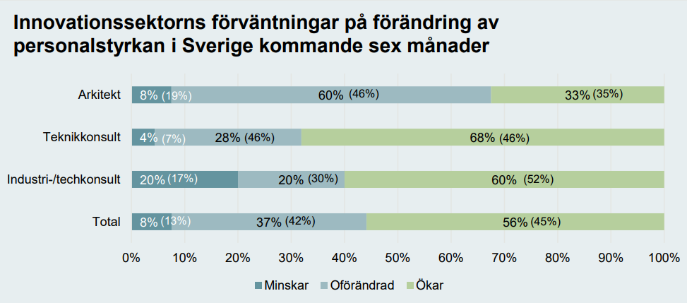 Utfallet för personalutvecklingen under det senaste halvåret speglar ett fortsatt osäkert konjunkturläge, med tydliga skillnader mellan delbranscherna inom innovationssektorn. Bland industri- och techkonsultföretagen uppger en relativt stor andel att personalstyrkan har minskat. Sammantaget anger 40 procent av företagen att de har genomfört personalneddragningar under perioden, vilket indikerar att efterfrågan inom flera industrinära marknader utvecklats svagare än förväntat och att företagen tvingats anpassa bemanningen i ett läge präglat av hög osäkerhet.