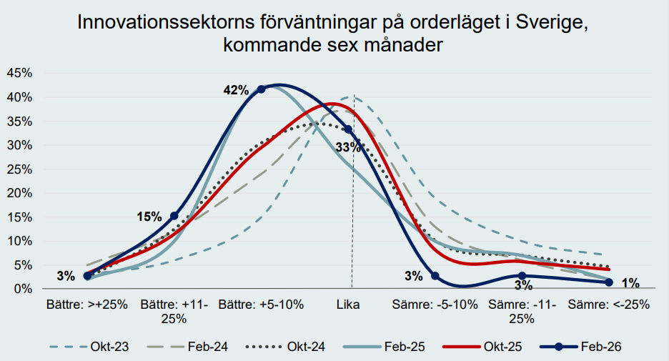 Förväntningarna på orderutvecklingen i innovationssektorn stärks återigen efter den tillfälliga nedgång som noterades vid föregående mätning. Jämfört med den senaste mätningen är det nu en tydligt större andel företag som räknar med en ökad orderingång under det kommande halvåret. Det trendbrott som kunde anas i februari 2025 framstår därmed som mer varaktigt och ser i den aktuella mätningen ut att konsolideras.