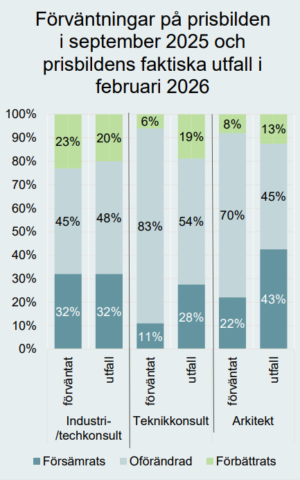 För teknikkonsultföretagen visar jämförelsen mellan tidigare förväntningar och nu rapporterat utfall ett mer blandat mönster. I september 2025 var det 6 procent som förväntade sig förbättrade priser, medan 19 procent i efterhand uppger att priserna faktiskt förbättrades under det senaste halvåret. Samtidigt upplever 28 procent av företagen att prisbilden försämrats, vilket kan ställas mot att endast 11 procent i den föregående mätningen förväntade sig en försämring.