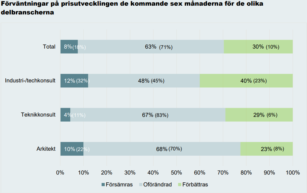 Utvecklingen av prisbilden visar tecken på att den nedåtgående trend som dominerat tidigare mätningar har brutits, även om den samlade bedömningen fortsatt är negativ. Särskilt inom arkitektbranschen är prisutvecklingen fortfarande svag, medan industri- och techkonsultföretagen uppvisar tydligare tecken på förbättring. Förväntningarna inför det kommande halvåret är dock genomgående mer positiva, vilket – i kombination med en relativt god träffsäkerhet i tidigare bedömningar – ger indikationer om ett successivt förbättrat prisläge framöver.